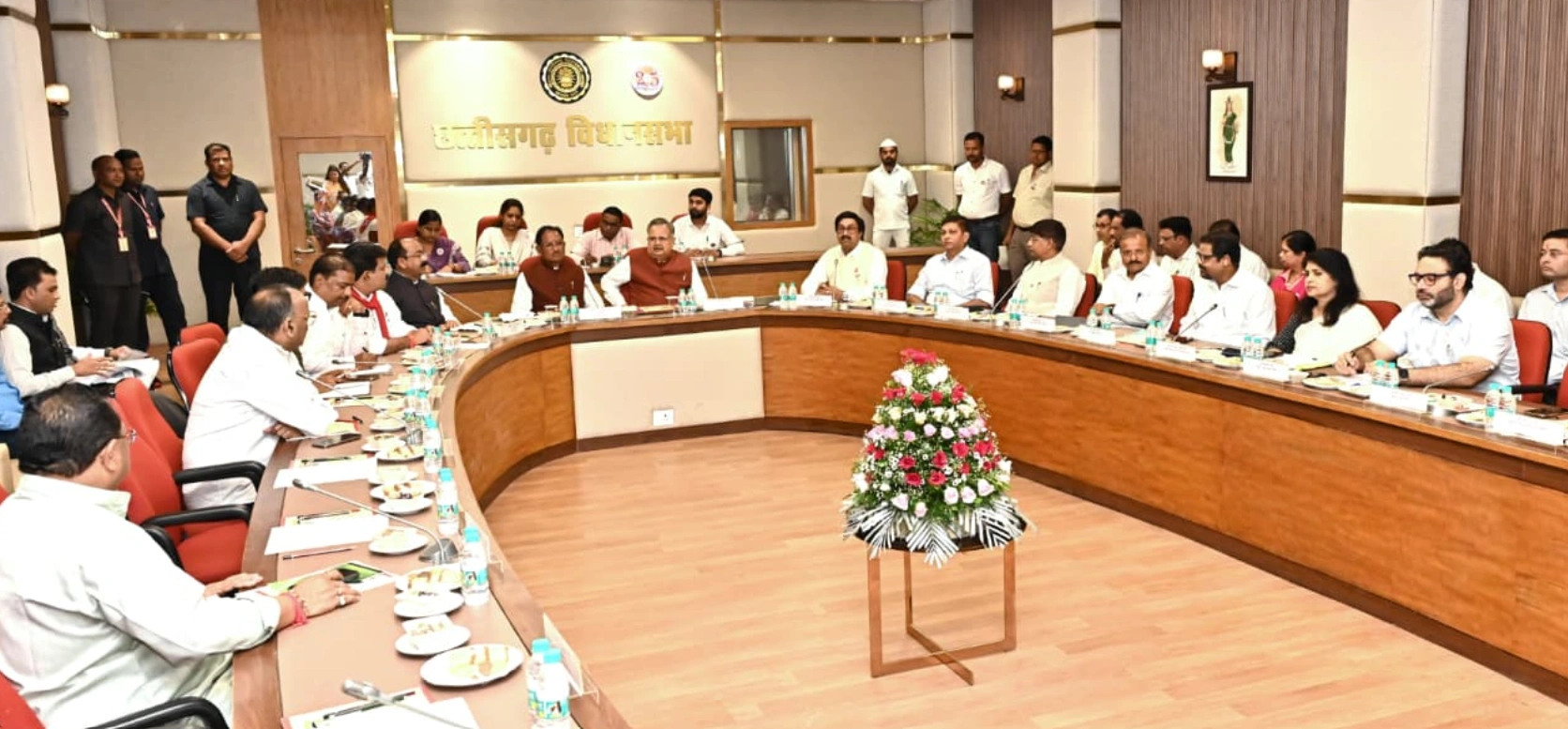 रायपुर, 16 सितम्बर 2025- विधानसभा अध्यक्ष डॉ. रमन सिंह और मुख्यमंत्री विष्णु देव साय की अध्यक्षता में आज विधानसभा परिसर स्थित मुख्य समिति कक्ष में प्रधानमंत्री नरेन्द्र मोदी के छत्तीसगढ़ आगमन की तैयारियों को लेकर महत्वपूर्ण बैठक आयोजित हुई। बैठक में उप मुख्यमंत्री अरुण साव, उप मुख्यमंत्री विजय शर्मा, वनमंत्री एवं संसदीय कार्यमंत्री केदार कश्यप, वित्त मंत्री ओ.पी. चौधरी, विधायक अजय चंद्राकर, विधायक प्रबोध मिंज, विधायक भावना बोहरा, विधायक अनुज शर्मा, मुख्य सचिव अमिताभ जैन, विधानसभा सचिव दिनेश शर्मा, पुलिस महानिदेशक अरुण देव गौतम, मुख्यमंत्री के प्रमुख सचिव सुबोध कुमार सिंह तथा अन्य वरिष्ठ अधिकारी उपस्थित थे।