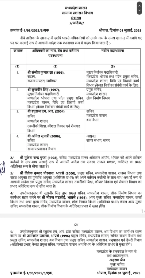 मध्य प्रदेश में प्रशासनिक फेरबदल: नए चेहरे, नई जिम्मेदारियाँ-मध्य प्रदेश सरकार ने हाल ही में कई अहम प्रशासनिक बदलाव किए हैं जिनसे राज्य के विभिन्न विभागों में नए चेहरे दिखाई दे रहे हैं। चुनाव से लेकर शिक्षा, ऊर्जा और राजस्व तक, कई महत्वपूर्ण पदों पर नए अधिकारियों की नियुक्ति हुई है। आइए, विस्तार से जानते हैं इन बदलावों के बारे में।