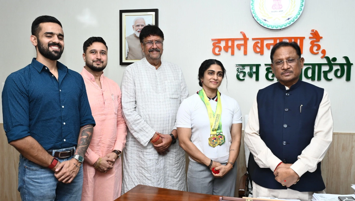 रायपुर 06 अगस्त 2025: मुख्यमंत्री विष्णुदेव साय से उनके निवास कार्यालय में एशियन अफ्रीकन पैसिफिक पावरलिफ्टिंग चैंपियनशिप की स्वर्ण पदक विजेता सुश्री नमी राय पारेख ने मुलाकात की। मुख्यमंत्री साय को रायपुर निवासी सुश्री नमी राय पारेख ने बताया कि 05 से 13 जुलाई तक जापान के हिमेजी में एशियन पॉवरलिफ्टिंग एसोसिएशन द्वारा एशियन अफ्रीकन पैसिफिक पावरलिफ्टिंग चैंपियनशिप का आयोजन किया गया था। इस चैंपियनशिप में उन्होंने 57 किलोग्राम डेडलिफ्ट वर्ग में स्वर्ण पदक हासिल किया है। मुख्यमंत्री विष्णुदेव साय ने सुश्री नमी राय पारेख को एशियन अफ्रीकन पैसिफिक पावरलिफ्टिंग चैंपियनशिप में स्वर्ण पदक हासिल करने पर बधाई दी। उन्होंने कहा कि आपने अपनी मेहनत और समर्पण से छत्तीसगढ़ का मान बढ़ाया है। प्रदेश की बेटियों को आपकी उत्कृष्ट उपलब्धि से प्रेरणा मिलेगी। इस अवसर पर अंजय शुक्ला, अंजिनेश शुक्ला, सनी पारेख सहित अन्य गणमान्यजन उपस्थित थे।