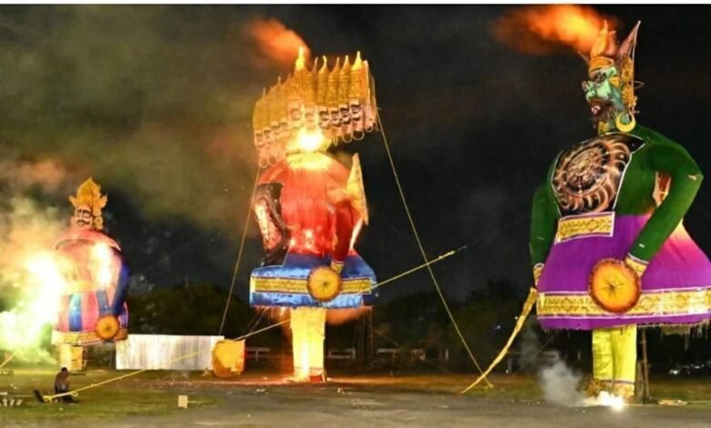 रायपुर के डब्ल्यूआरएस मैदान में बुराई के प्रतीक 101 फीट ऊंचे रावण के पुतले का दहन