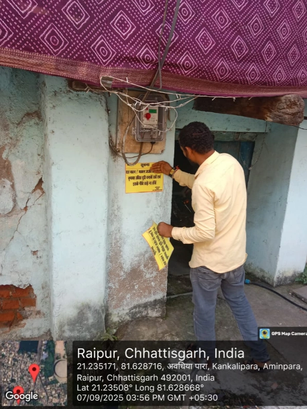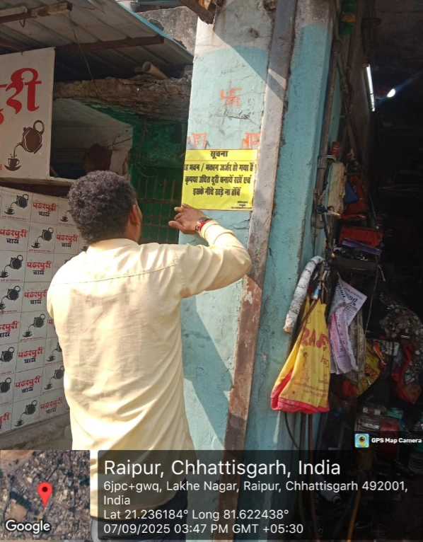 रायपुर – रायपुर नगर पालिक निगम रायपुर के आयुक्त विश्वदीप के आदेशानुसार और नगर निवेशक आभाष मिश्रा के निर्देशानुसार नगर निगम मुख्यालय नगर निवेश उड़नदस्ता और नगर निगम जोन 4 नगर निवेश विभाग की टीम द्वारा दिनांक 8 सितम्बर 2025 की रात्रि में राजधानी शहर रायपुर के विभिन्न मुख्य मार्गो से निकलने जा रही श्रीगणेश मूर्ति विसर्जन चल झांकी के निर्धारित रूट मार्ग में सदर बाजार, सत्ती बाजार, कंकाली तालाब, पुरानी बस्ती, अवधियापारा, अमीनपारा, बैजनाथपारा मार्ग में स्थित विभिन्न पुराने /जर्जर भवनों के स्वामियों को नोटिस जारी कर जर्जर / पुराने भवनों की तत्काल मरम्मत करवाने अथवा उन्हें हटाने के निर्देश दिए हैँ और 8 सितम्बर को रात्रि में निकलने वाली श्रीगणेश विसर्जन चल झांकी रूट मार्ग पर स्थित सभी पुराने/ जर्जर भवनों में स्टीकर लगाकर पुराने / जर्जर भवन से उचित दूरी बनाये रखने और उसके नीचे खड़े ना होने की नगर निवेश विभाग ने नागरिकों से अपील की है.