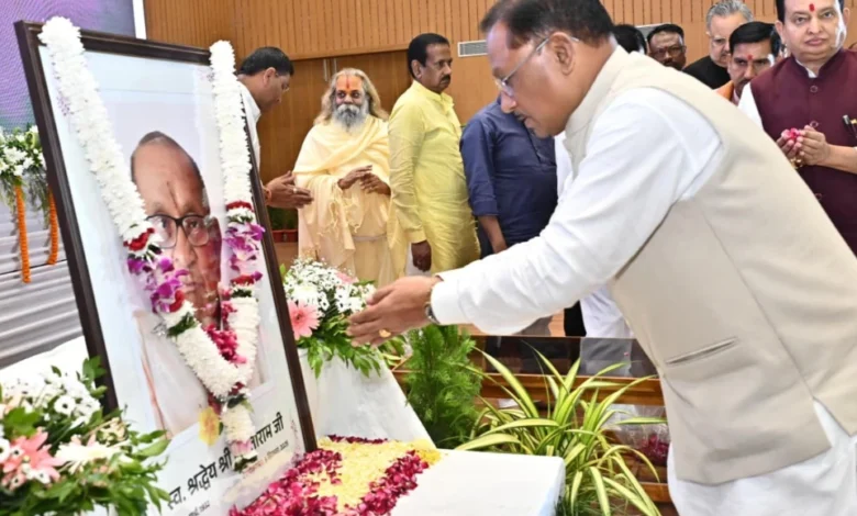 रायपुर, 19 सितंबर 2025- मुख्यमंत्री विष्णुदेव साय आज राजधानी रायपुर स्थित इंदिरा गांधी कृषि विश्वविद्यालय के सभागार में आयोजित शांता राम सर्राफ जी की श्रद्धांजलि सभा में सम्मिलित हुए। मुख्यमंत्री साय ने शांता राम सर्राफ जी के छायाचित्र पर पुष्पांजलि अर्पित कर उन्हें श्रद्धांजलि दी। उन्होंने ईश्वर से प्रार्थना की कि दिवंगत आत्मा को अपने श्रीचरणों में स्थान दें तथा शोकाकुल परिजनों को दुःख को सहन करने की शक्ति प्रदान करे। इस अवसर पर विधानसभा अध्यक्ष डॉ. रमन सिंह, पूर्व राज्यपाल रमेश बैस, उपमुख्यमंत्रीद्वय अरुण साव एवं विजय शर्मा, कैबिनेट मंत्री केदार कश्यप, लखनलाल देवांगन, दयालदास बघेल, श्याम बिहारी जायसवाल, गजेन्द्र यादव, टंकराम वर्मा, लक्ष्मी रजवाड़े सहित अन्य गणमान्यजन बड़ी संख्या में उपस्थित थे।