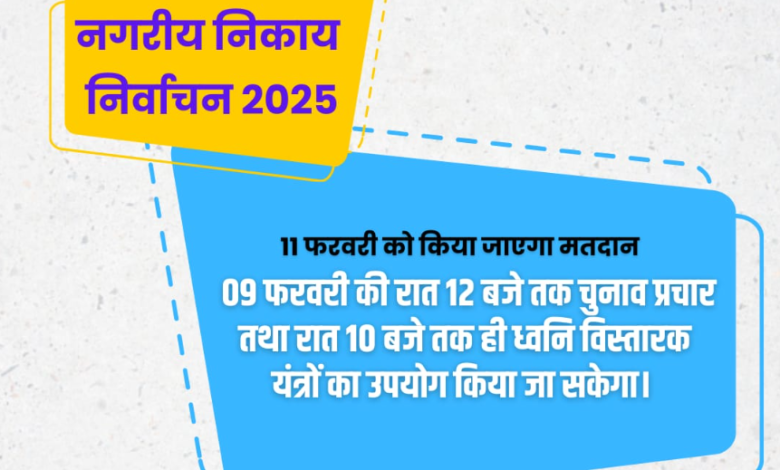 रायपुर 8 फरवरी 2025: नगरीय निकाय चुनाव में 11 फरवरी को मतदान किया जाएगा। इसके पूर्व 9 फरवरी को रात 12 बजे तक चुनाव प्रचार किया जा सकता है। साथ ही 9 फरवरी की रात 10 बजे के पश्चात ध्वनि विस्तारक यंत्रों की अनुमति नहीं होने के कारण रात्रि 10 बजे से 12 बजे के बीच होने वाले चुनाव प्रचार की अनुमति देते समय इन सभी प्रावधानों का ध्यान रखा जाएगा।