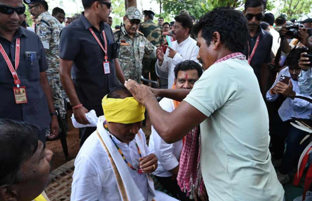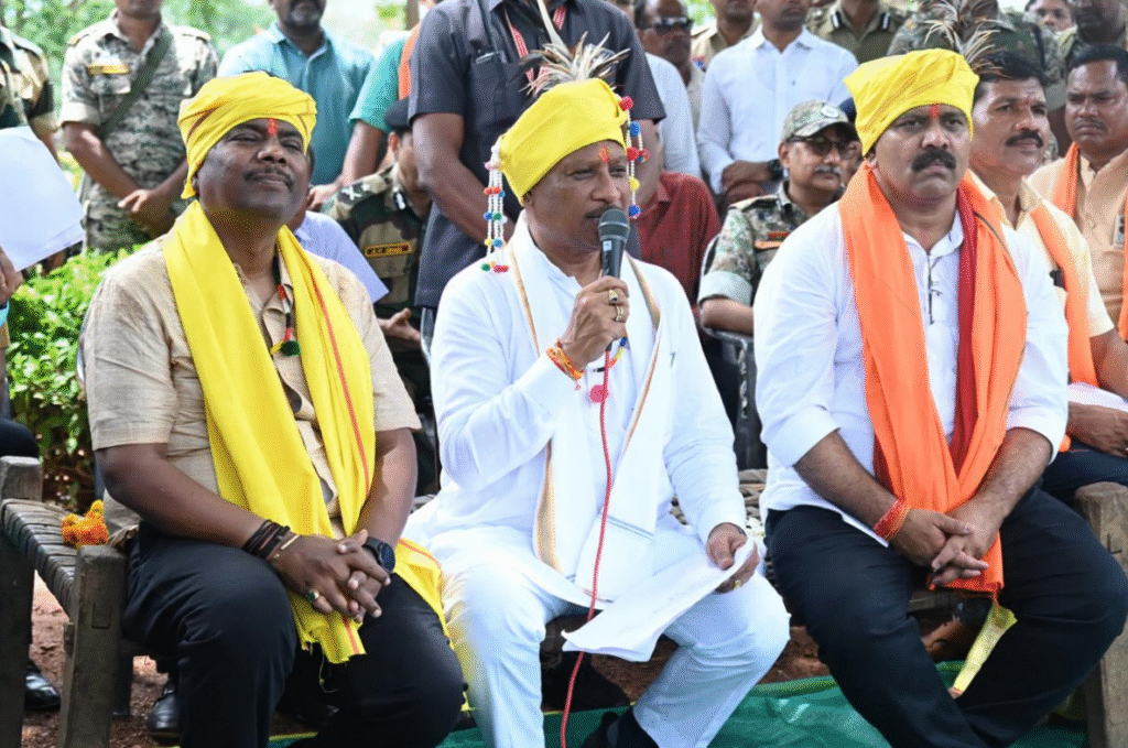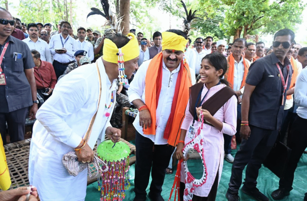 पारंपरिक तरीके से ग्रामीणों ने किया मुख्यमंत्री, उप मुख्यमंत्री और वनमंत्री का स्वागत