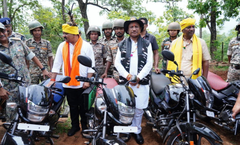 बासिंग सुरक्षा कैंप में आयोजित कार्यक्रम में मुख्यमंत्री विष्णु देव साय ने सुरक्षा बलों को गस्त करने के लिए 50 बाइक को जवानों के साथ हरी झंडी दिखाकर रवाना किया
